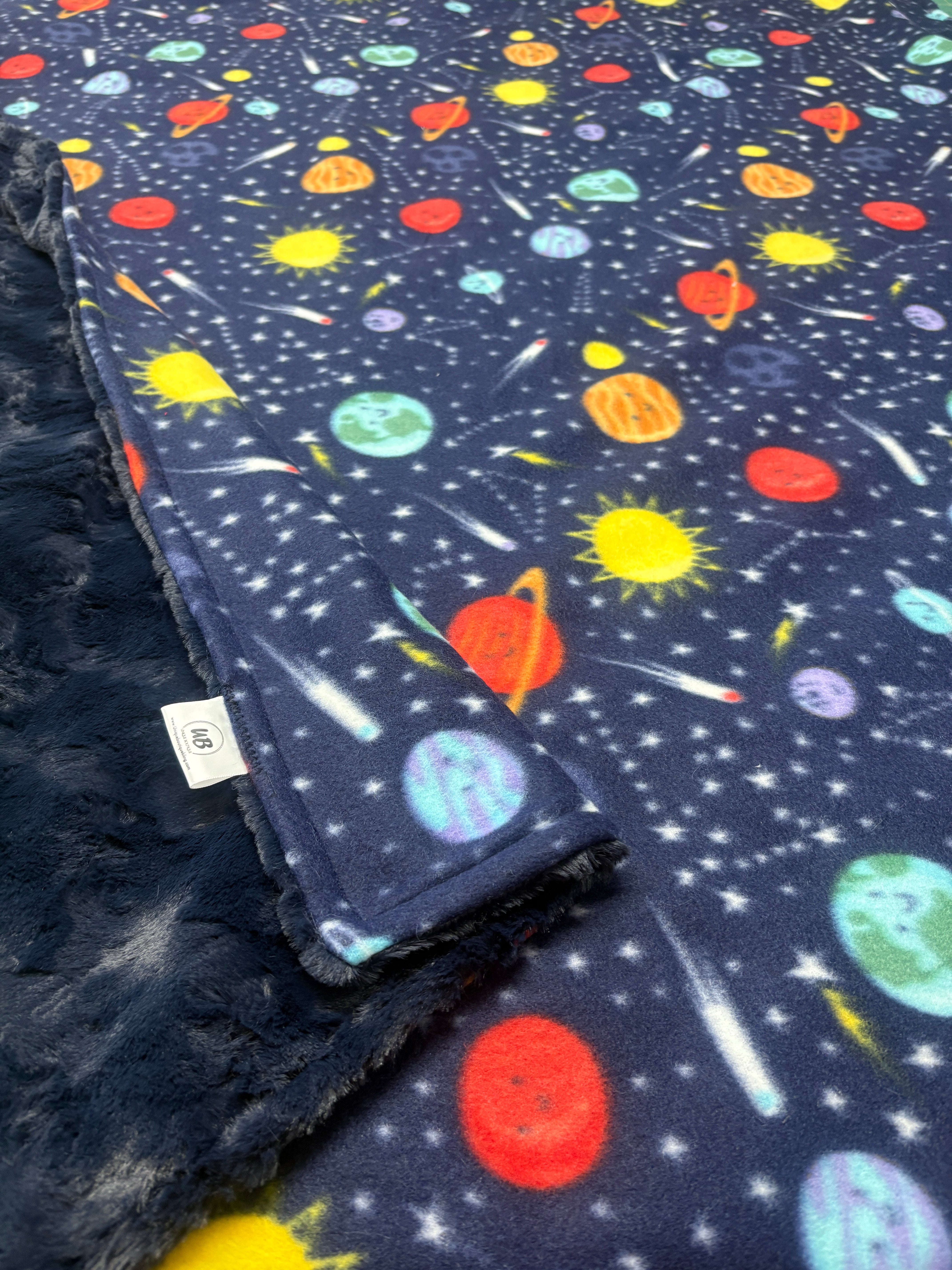 Navy Blue Fleece with Planets, Comet, Stars etc backed with Navy Luna Luxe Minky. Top-Stitched Edging.