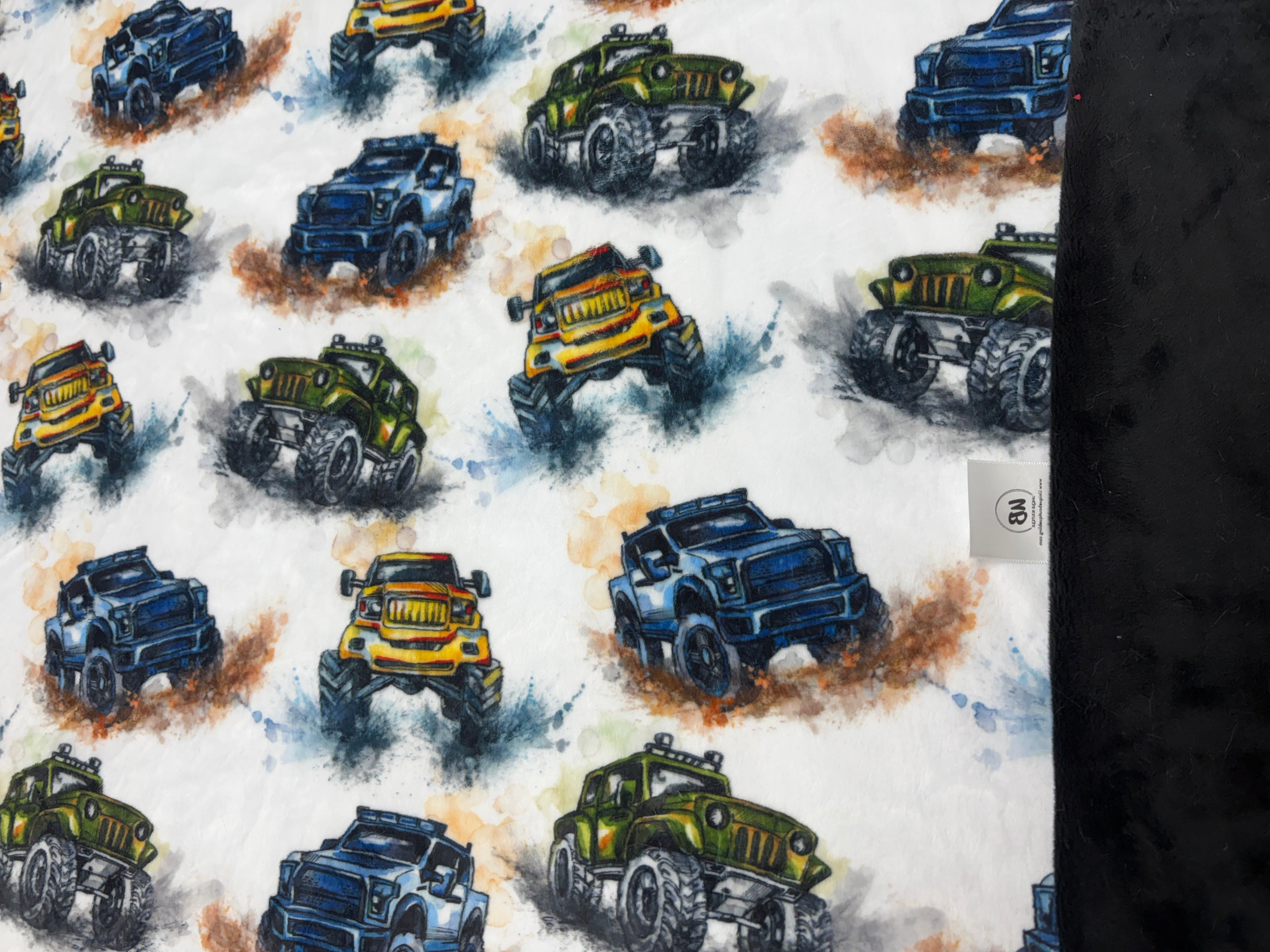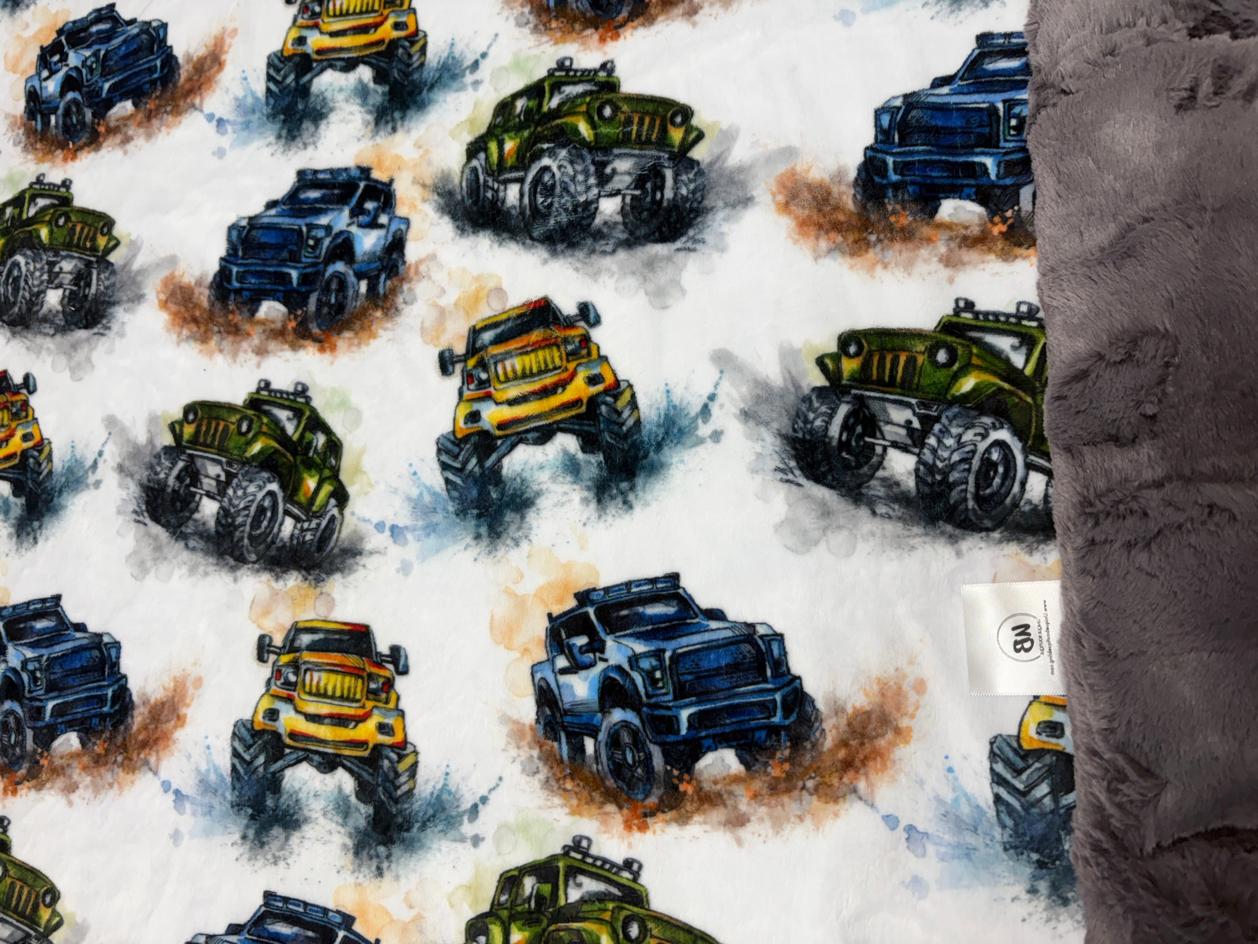 Perfect for the Truck Lover and the person with the need for adventure and speed. Big Wheel Trucks and Monster Trucks Off Raoding on white minky (2.5 mm high pile) backed with your choice of Luxe Hide Minky (10mm high pile) or C3 (3mm high pile). The BEST of Shannon Fabrics. Top-Stitched Edging.