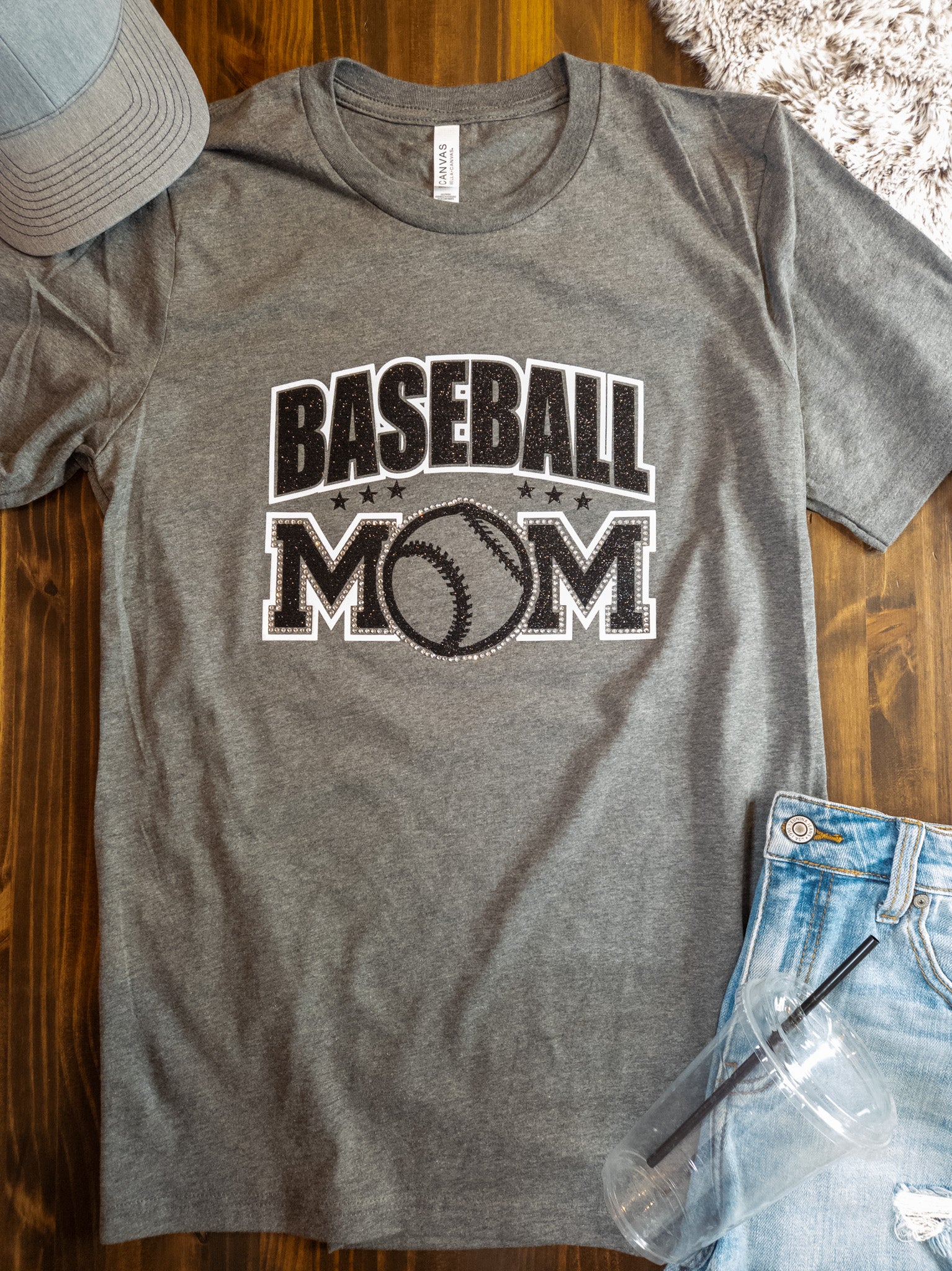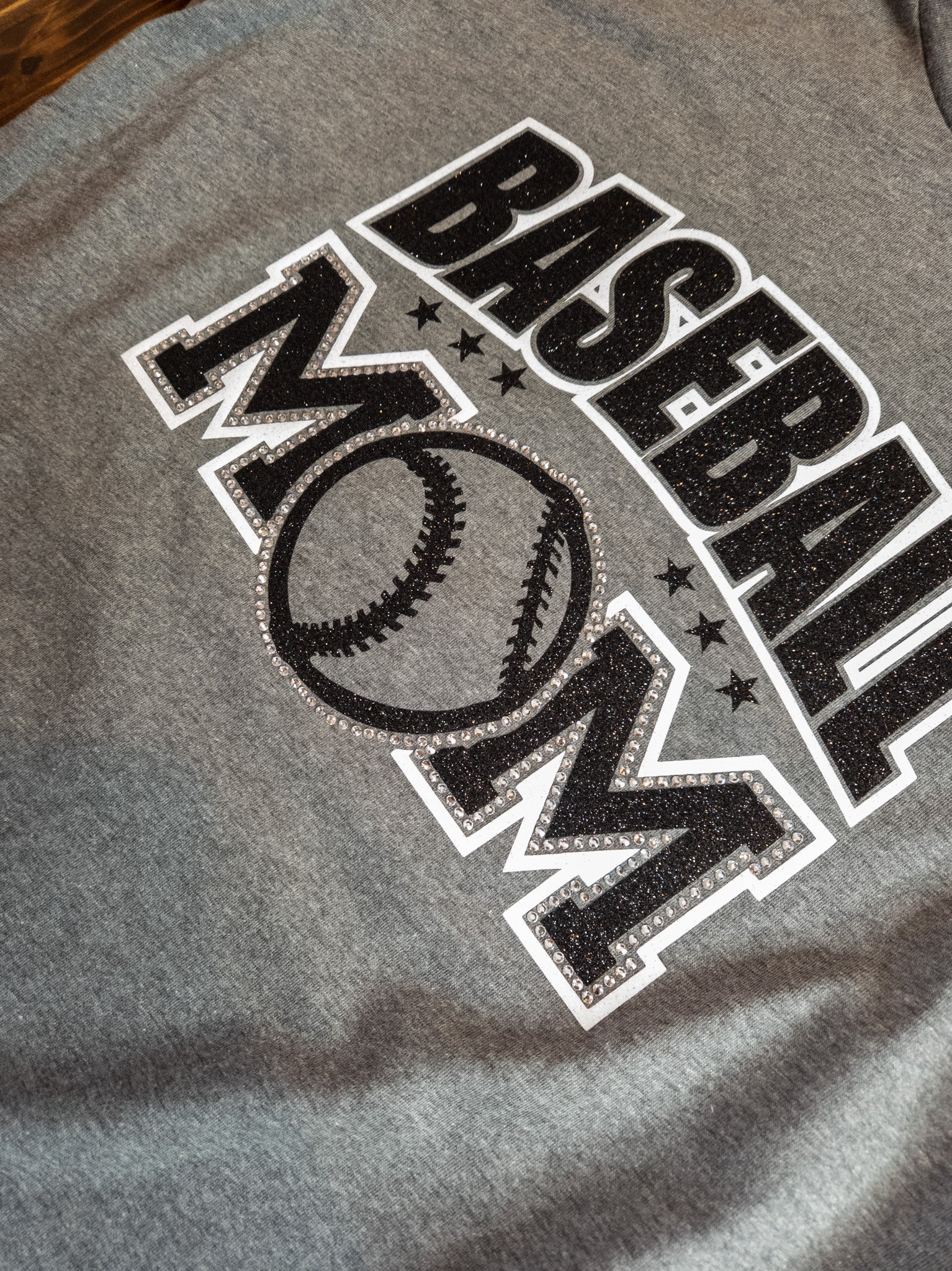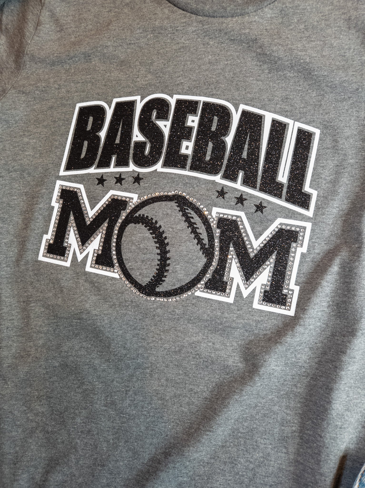 Baseball Mom you are going to sparkle and shine in this soft tee! A deep heather gray color in an adult fit. The white sparkle and black sparkle print with crystal rhinestones is stunning! If you would like to add your name on the back, please select the personalization option.