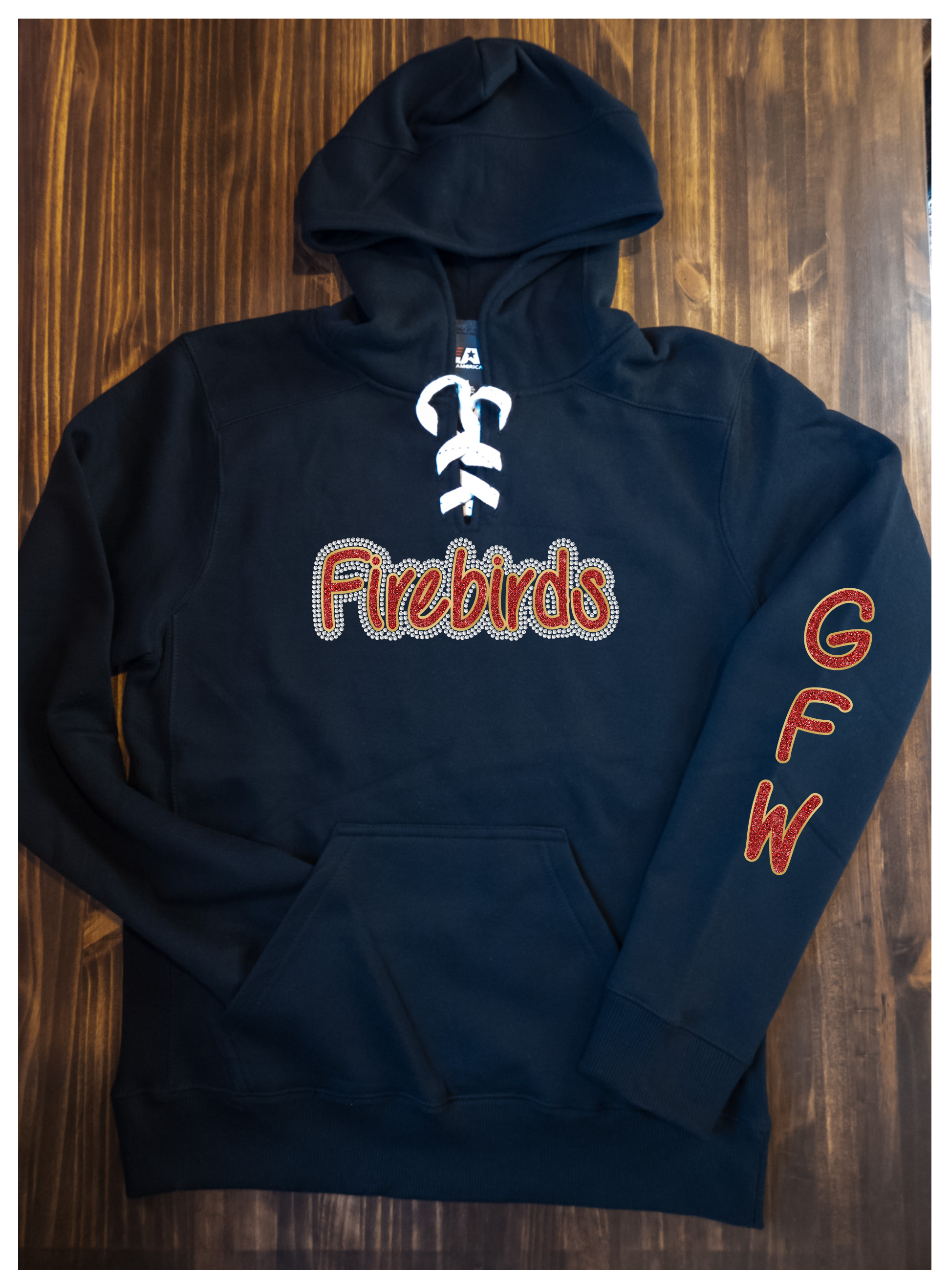Firebirds fan this one is for you! Sparkle away in this black lace-up hoodie featuring a front design and GFW text down the sleeve with gold metallic, red sparkle and crystal rhinestones. Two laces to match! If you would like to add your name to the back, please select the personalization option.