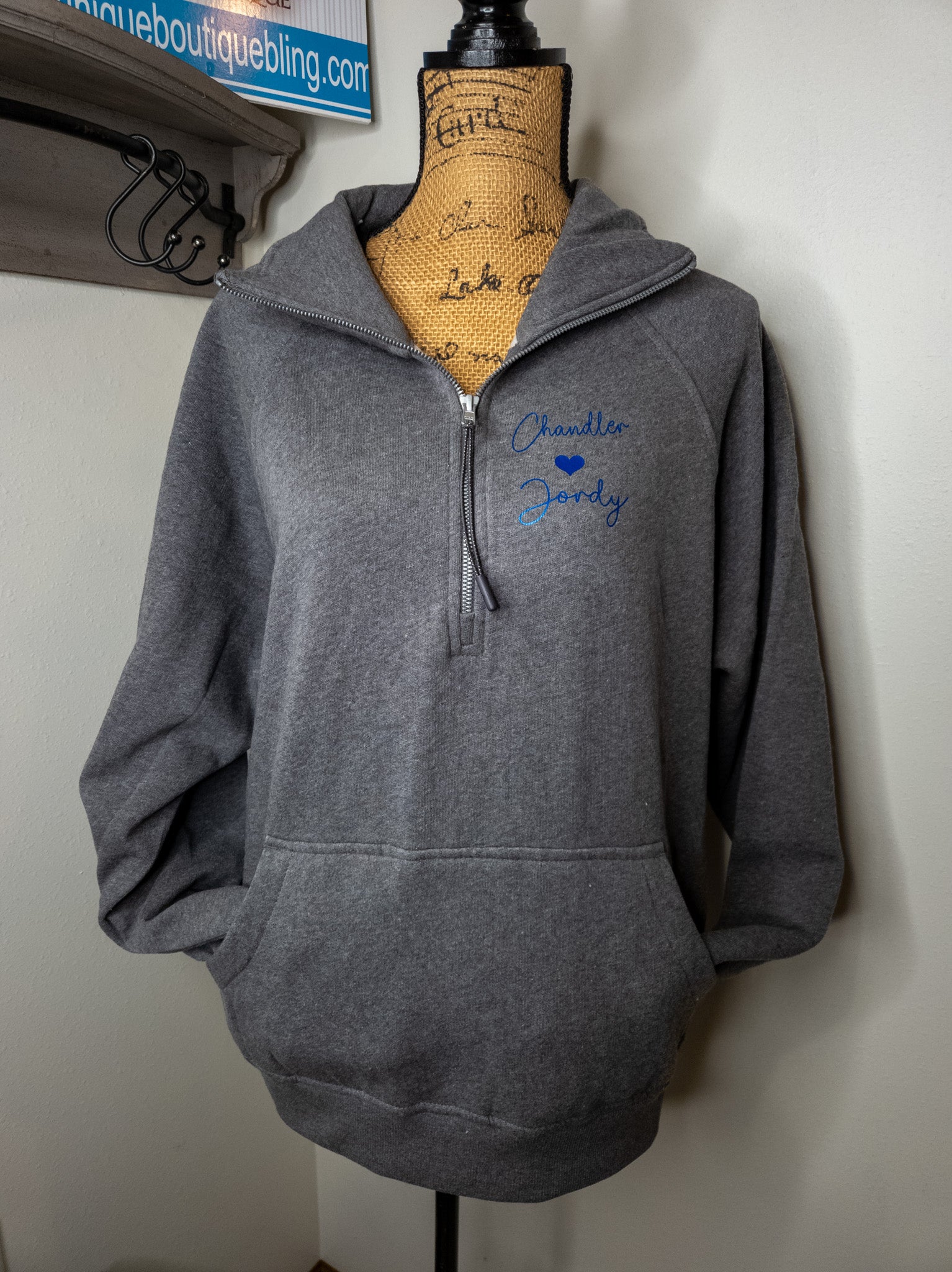 Perfect for all things dance! A relaxed, oversized fit, that is just so easy to grab and wear. So cozy and stylish! This half zip pullover has a cadet collar with a stylish zipper pull, raglan sleeves, ribbed cuffs and waistband, front pocket plus the color is gorgeous. To add your dancer's name on the front left chest, please select the personalization option.
