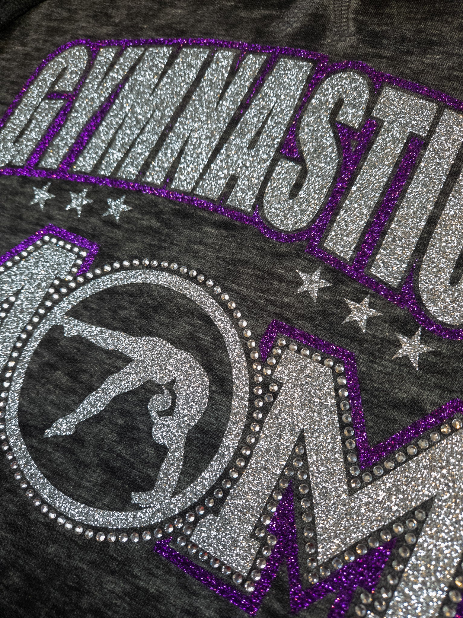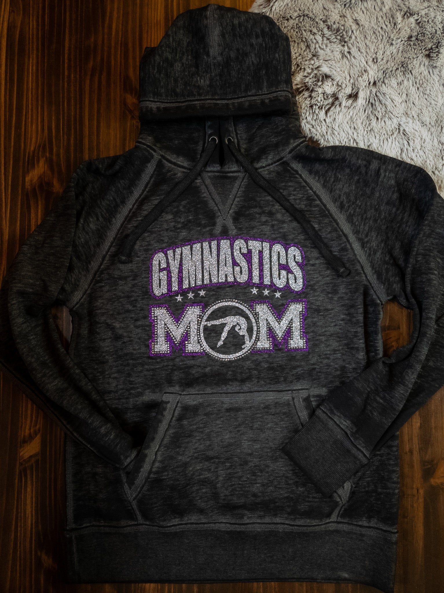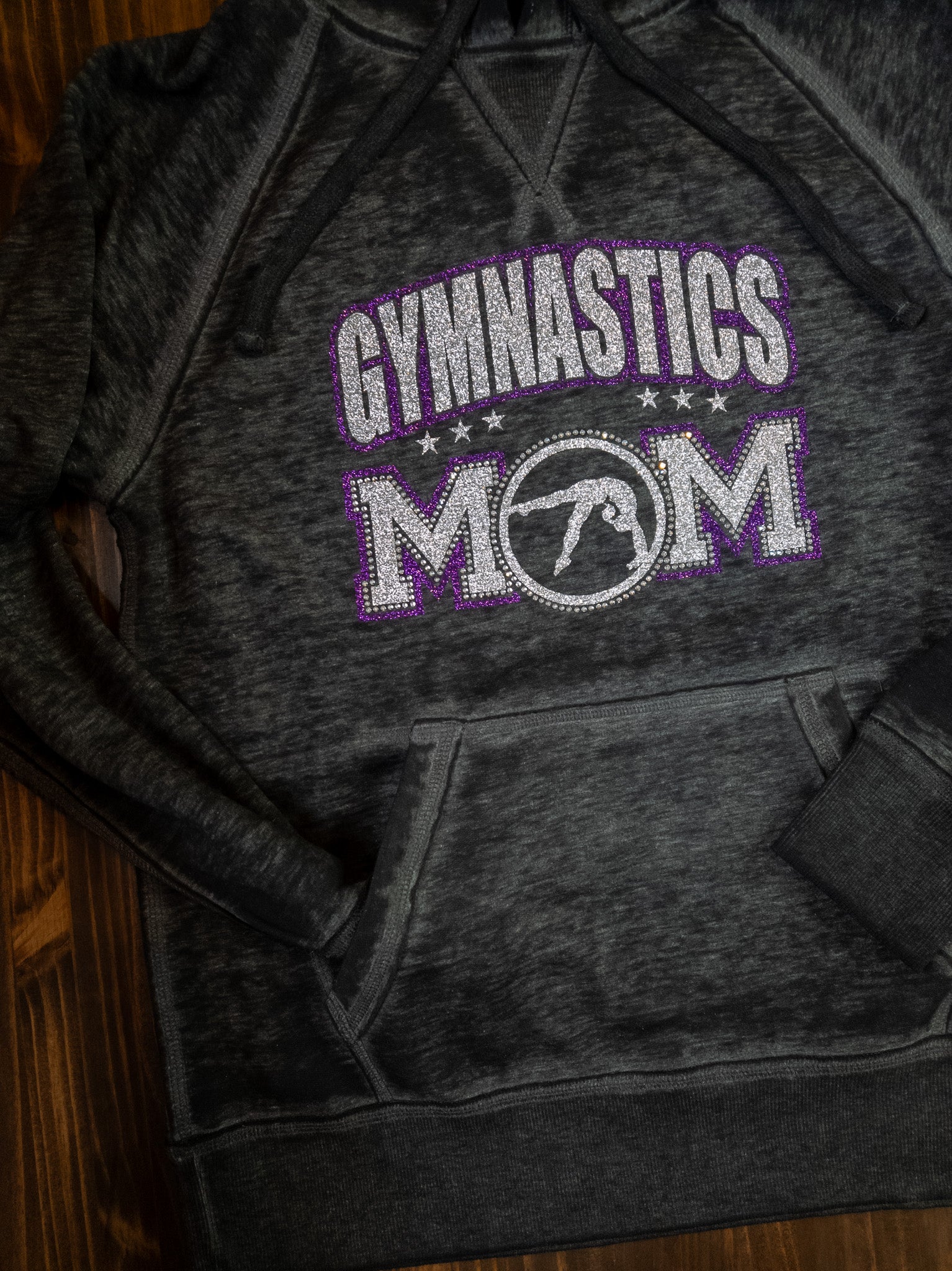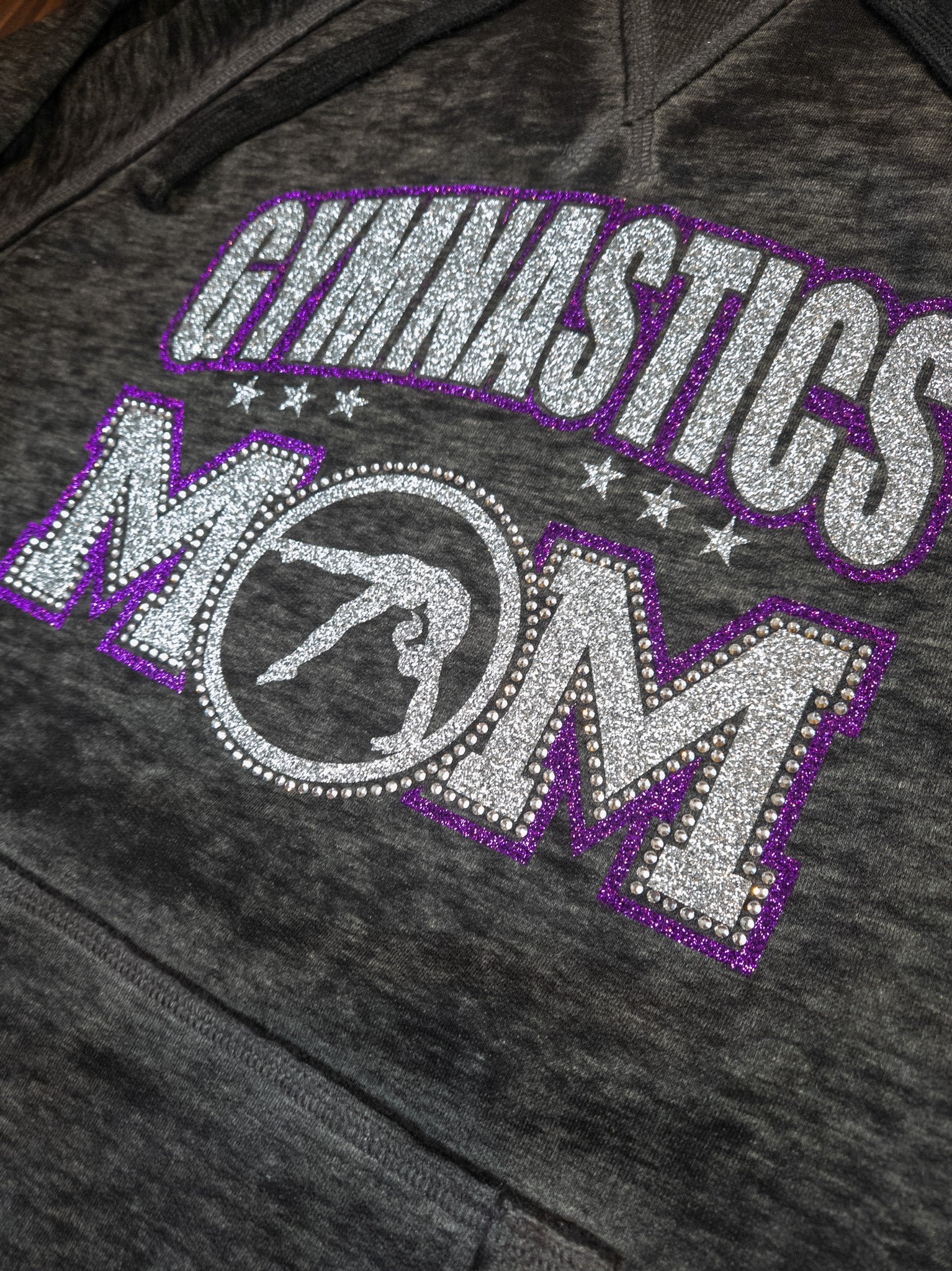 Gymnastics Mom you are going to sparkle and shine in this super soft hoodie! A black color in an adult fit. The silver sparkle and purple sparkle print with crystal rhinestones is stunning! Looking for a different color combination? Or maybe you want to add in your team color? Reach out to us and we can make that happen for you. If you would like to add your name on the back, please select the personalization option.