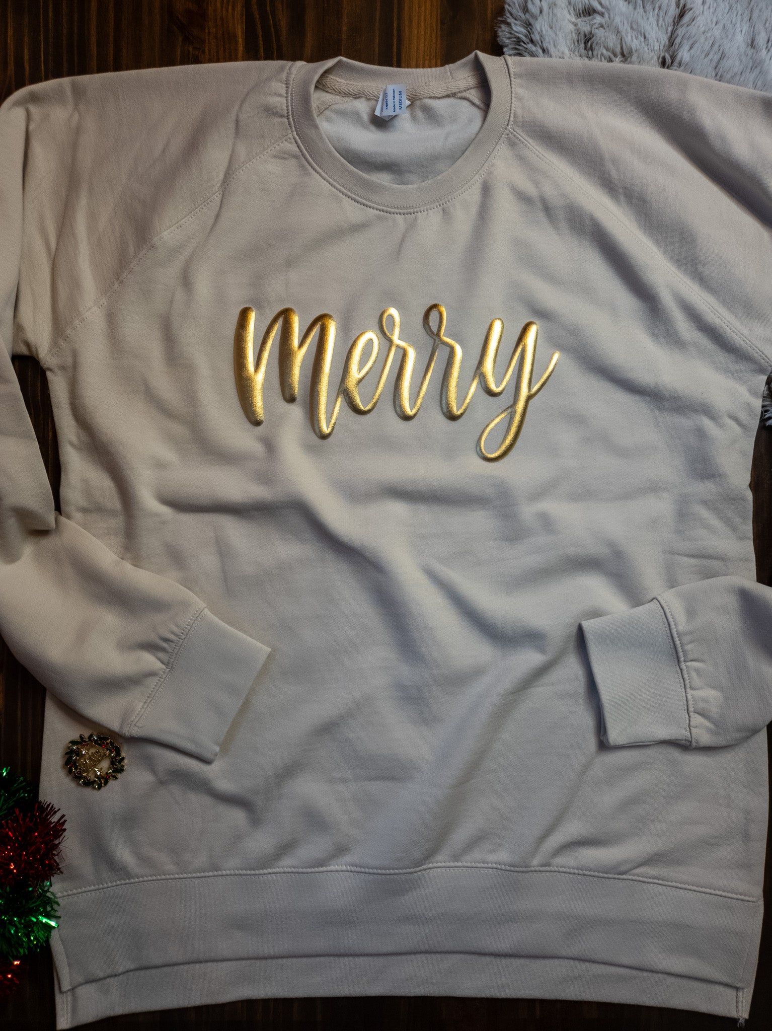 Merry Metallic Puff Ladies Ivory Crewneck