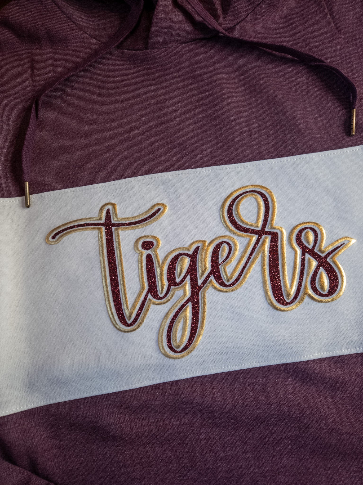 This colorblock league sweatshirt is a great addition to your spiritwear collection. The hoodie is made with a super soft fleece and a jersey lined hood with metal tipped drawcords for comfort and style. And the print is a big and bold style to make an impression. If you would like to add a name on the back, please select the personalization option.