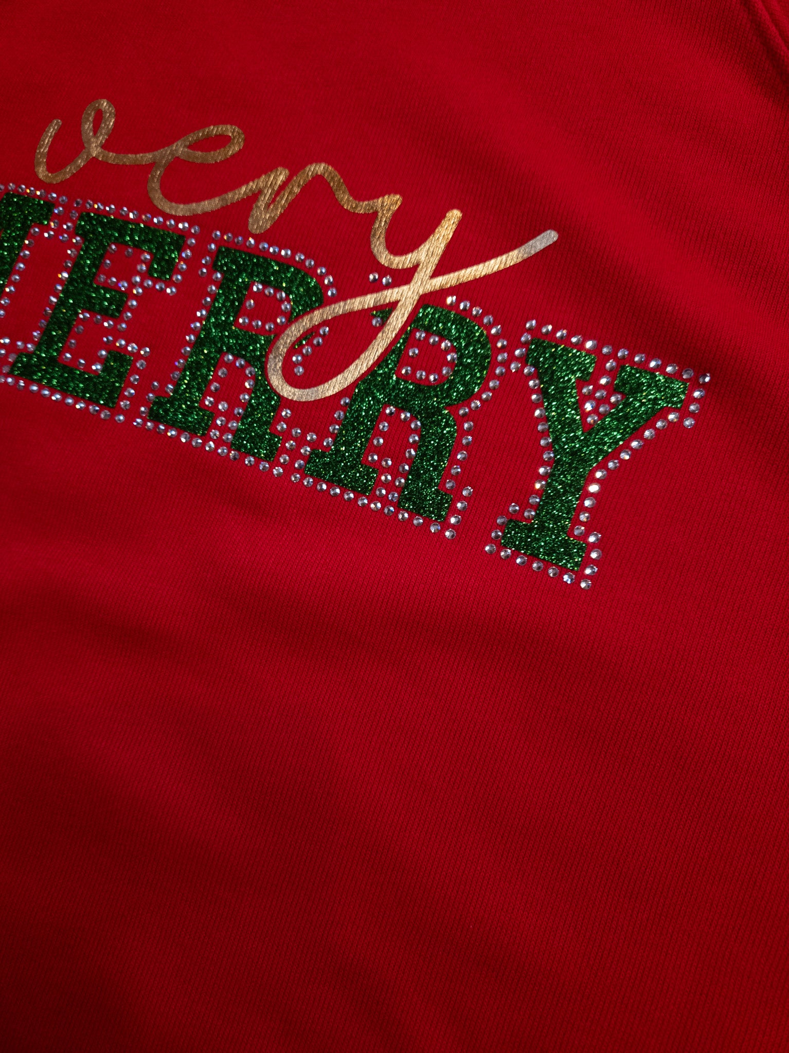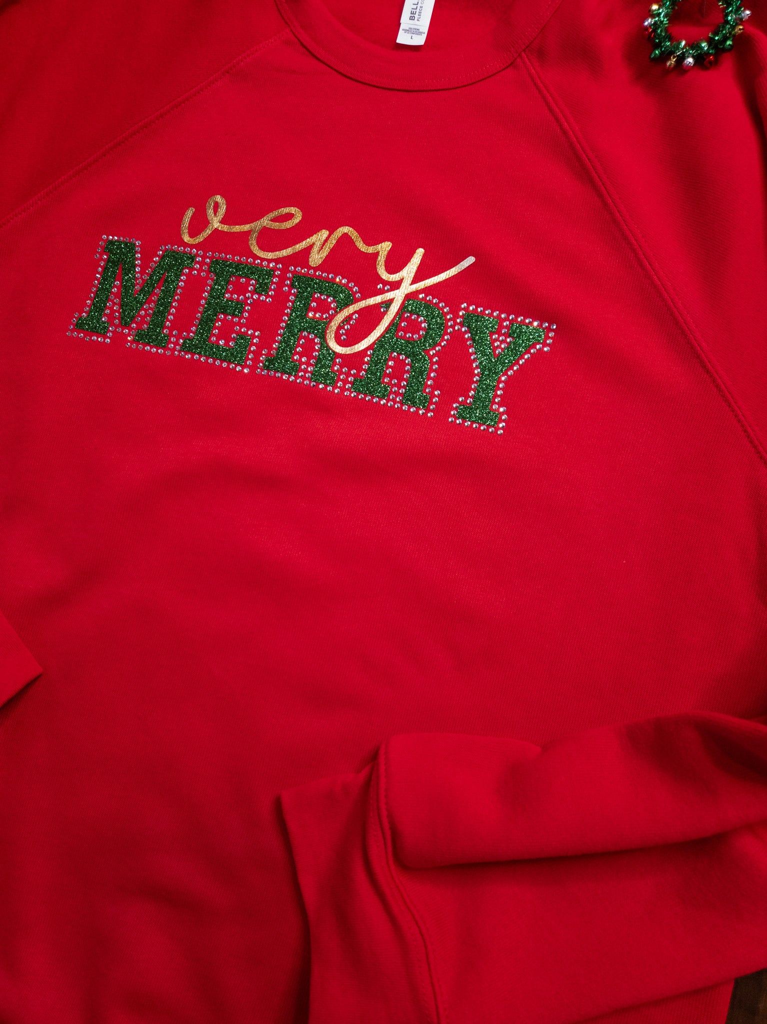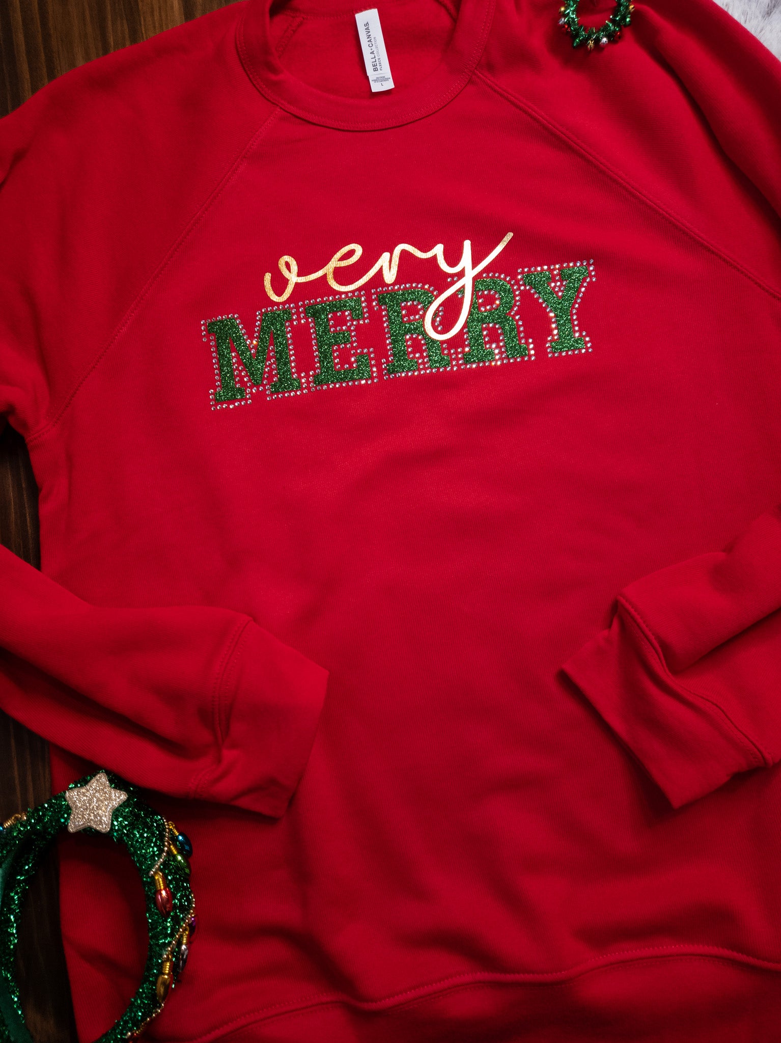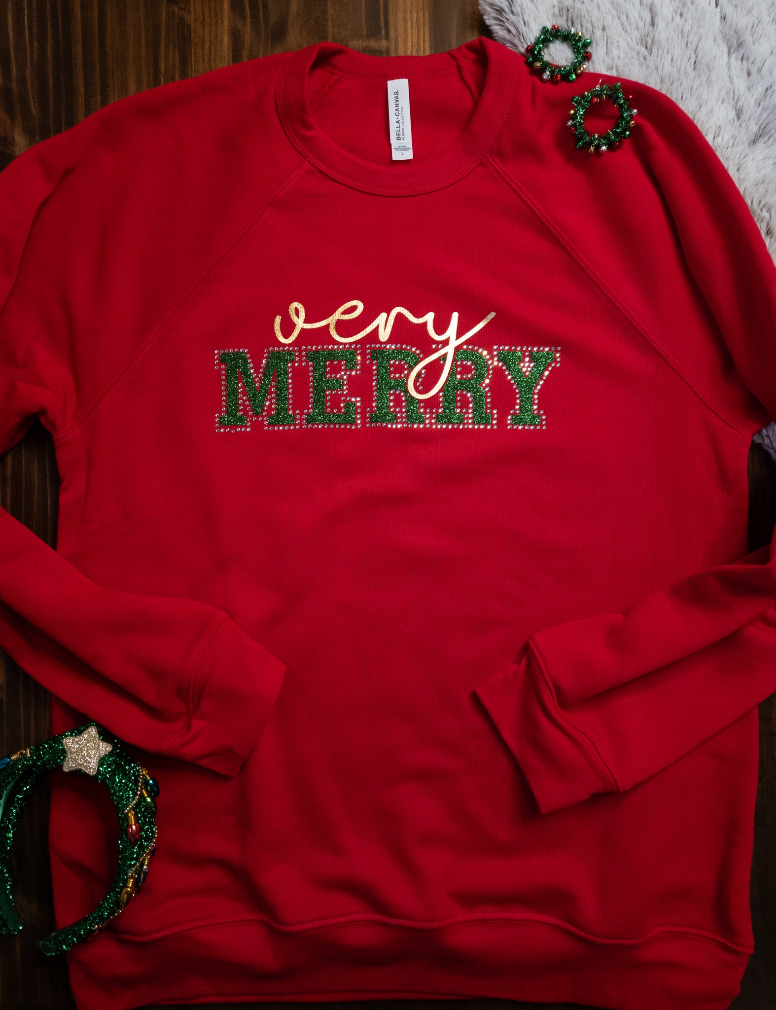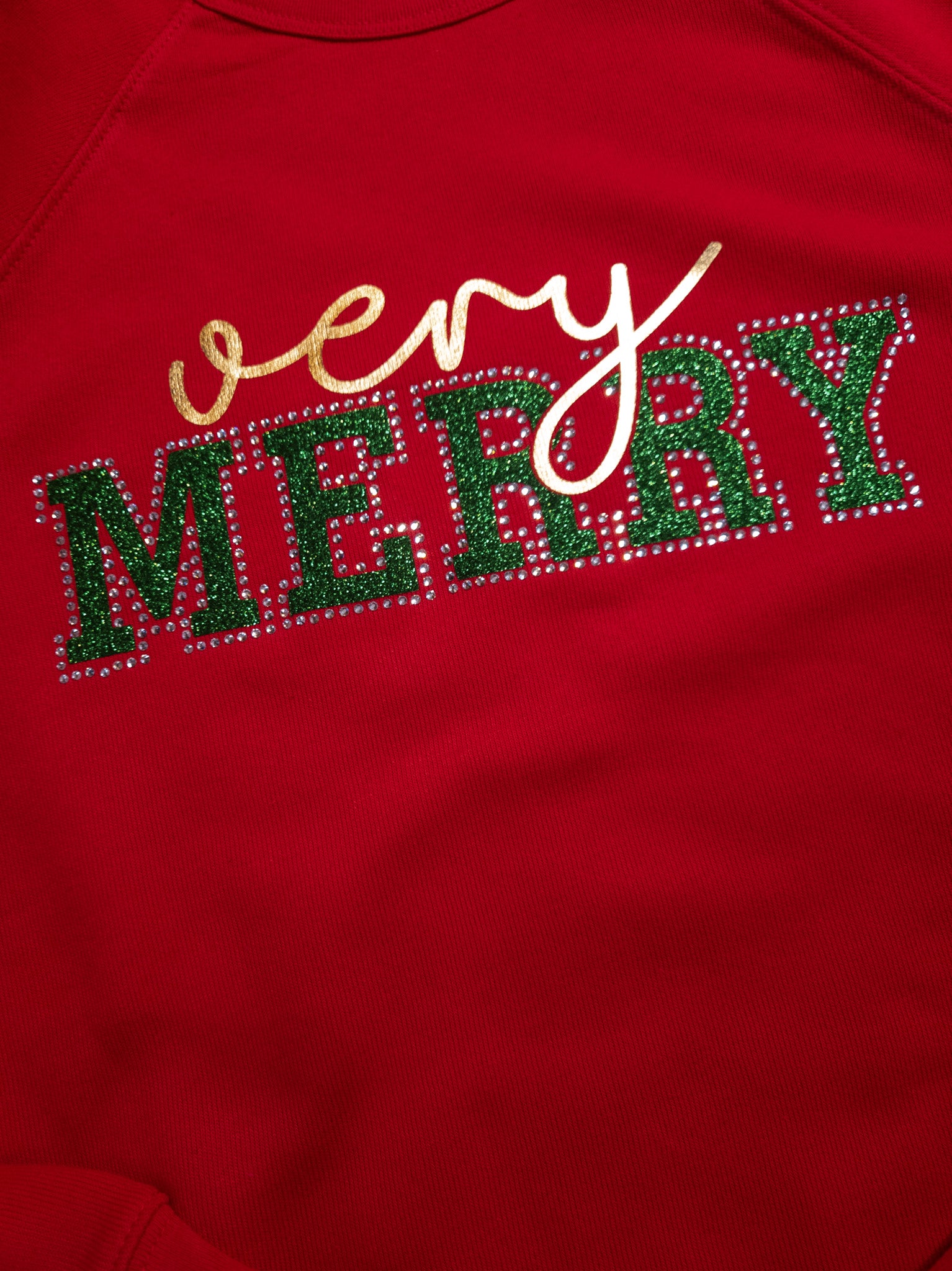Very Merry Rhinestone Red Sponge Fleece Crewneck Sweatshirt