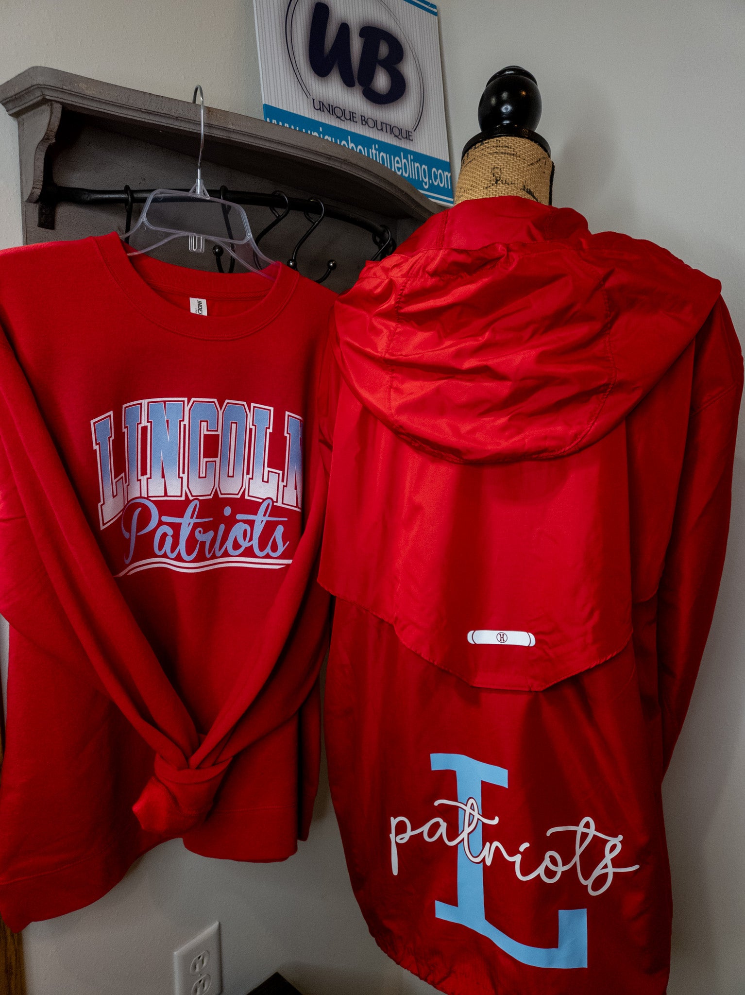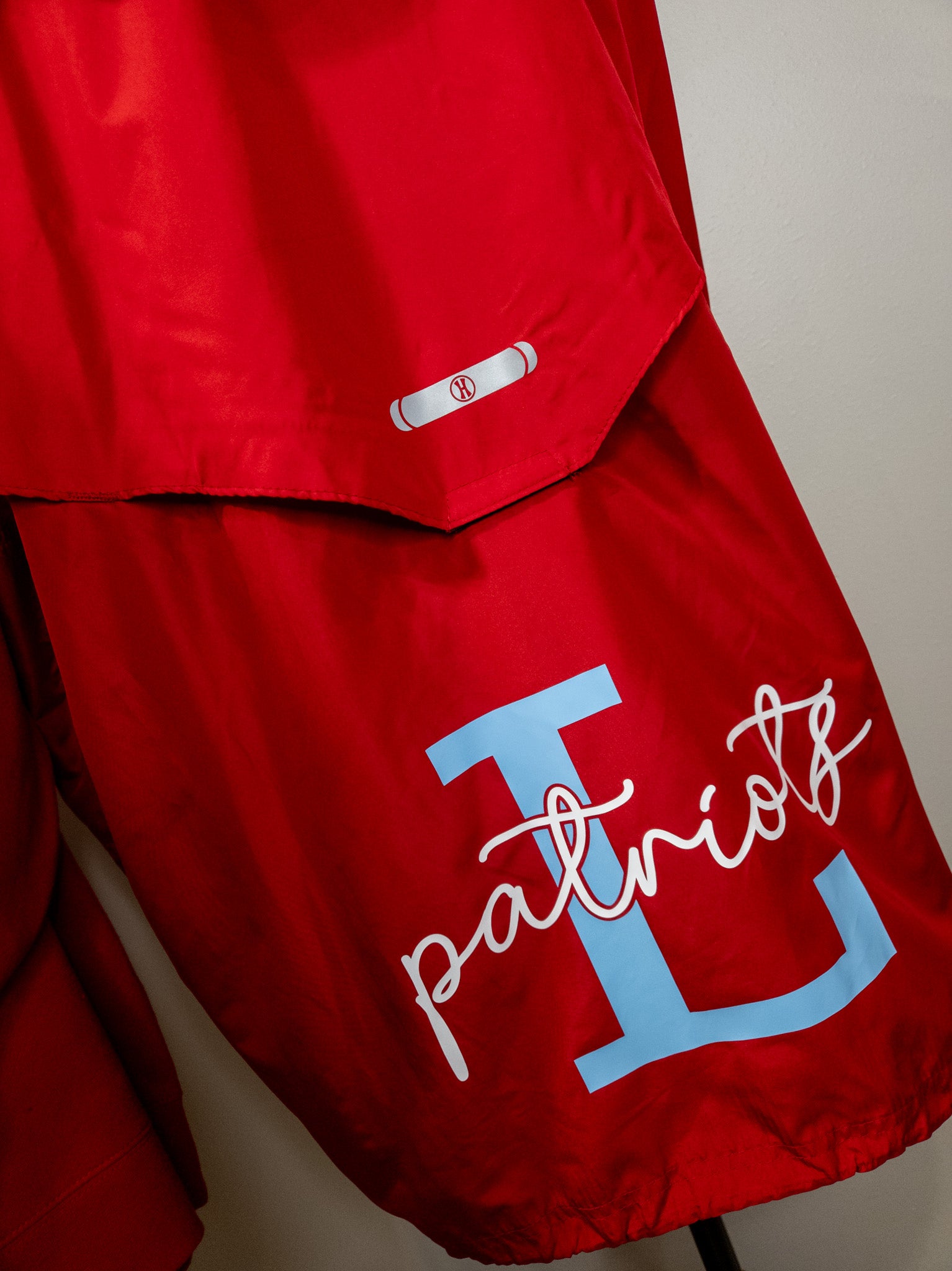 Layer up and head to your next Patriots event with this jacket! The back sports a large L Patriots design. Featuring a bold red color with reflective accents. It also has front zippered pockets (for all the things!), an open bottom and is a full zip. The jacket itself is wind and water resistant, in both a ladies fit and adult fit. If you would like to add your name or number on the front left chest, please select the personalization option.