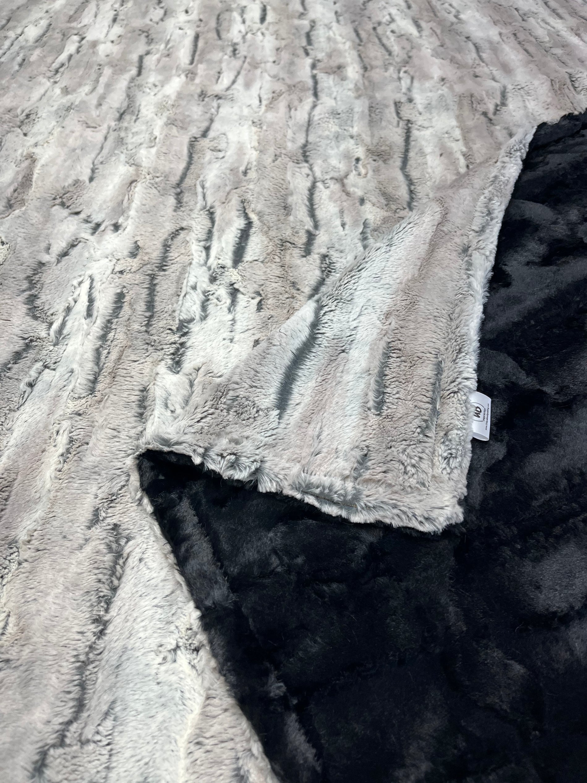 Black/Silver Sterling Fox Luxe Minky backed with Luscious Caviar Black Hide. Both top-quality Luxe Minky fabrics from Shannon Fabrics. "Our exclusive, luxurious Cuddle® minky fabric has an ultra-soft and creamy surface. Features an elegant mountain fox print." from Shannon Fabrics website about Fox Luxe Minky.
