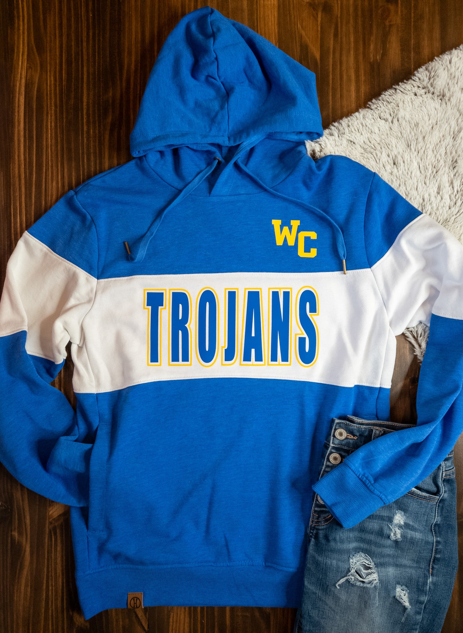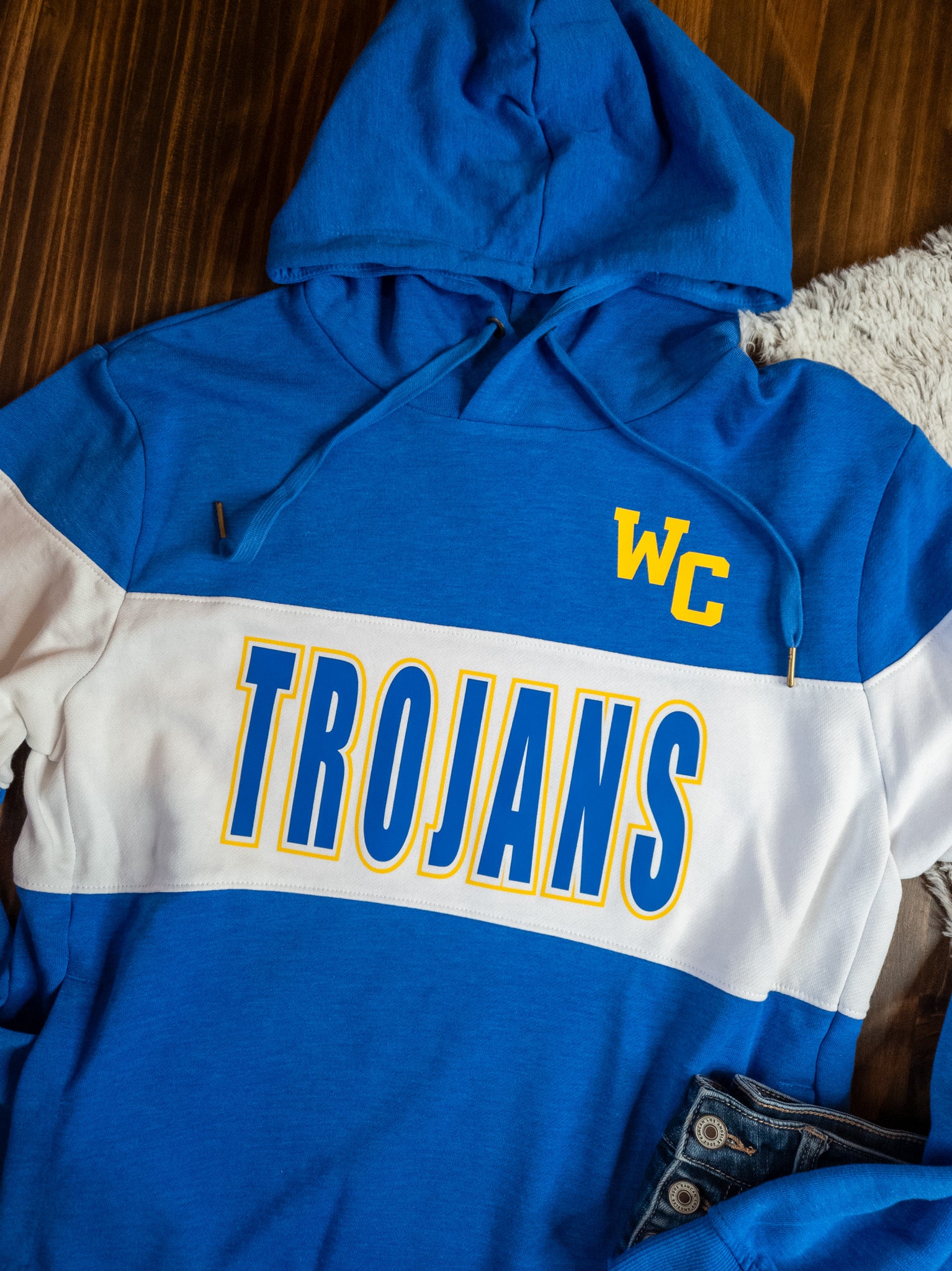This colorblock league sweatshirt is a great addition to your spiritwear collection. The hoodie is made with a super soft fleece and a jersey lined hood with metal tipped drawcords for comfort and style. And the print is a big and bold style to make an impression. If you would like to add a name on the back, please select the personalization option.