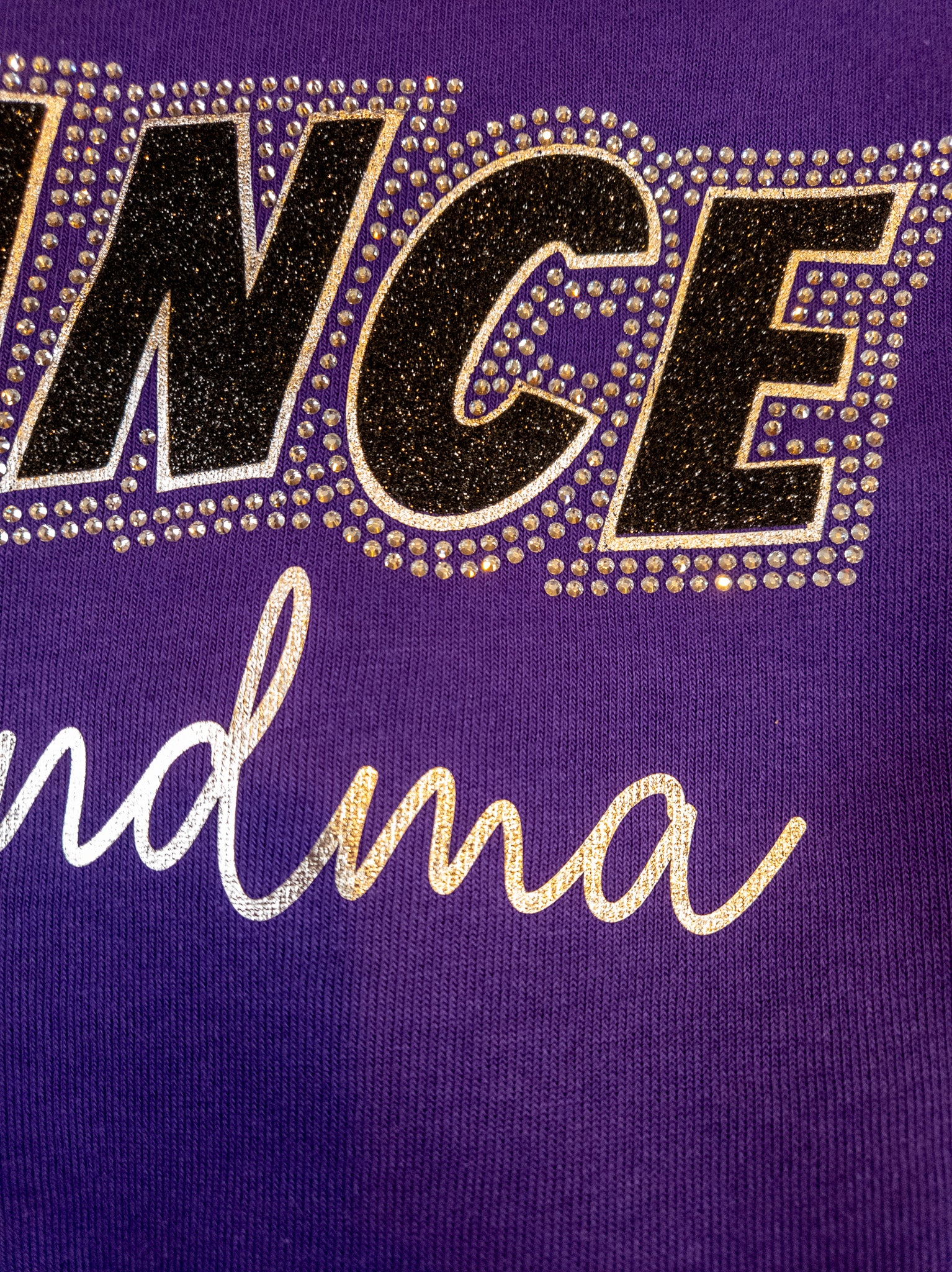 Be a proud Dance Grandma in this sparkly crewneck! This gem is so soft you aren't going to want to take it off. An awesome adult fit and super soft ringspun cotton. Pair it with your favorite jeans and head out the door! If you would like to add your name on the back, please select the personalization option. Love this look but prefer a different color combo, please reach out to us and we can make that happen!